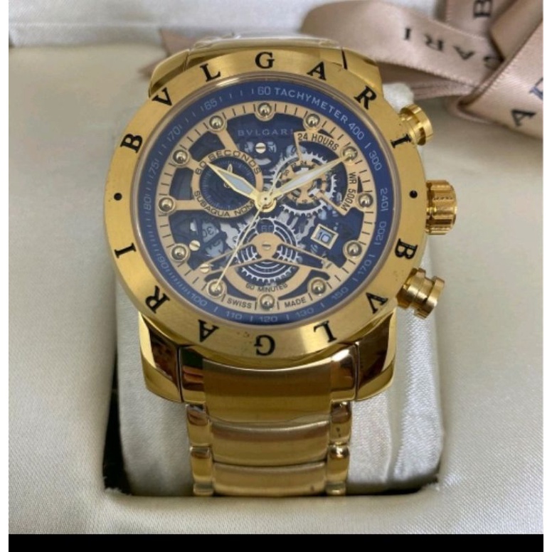 Mais legal Relogio Bvlgari Skeleton Dourado Fundo Dourado Azul C Caixa Premium Shopee Brasil